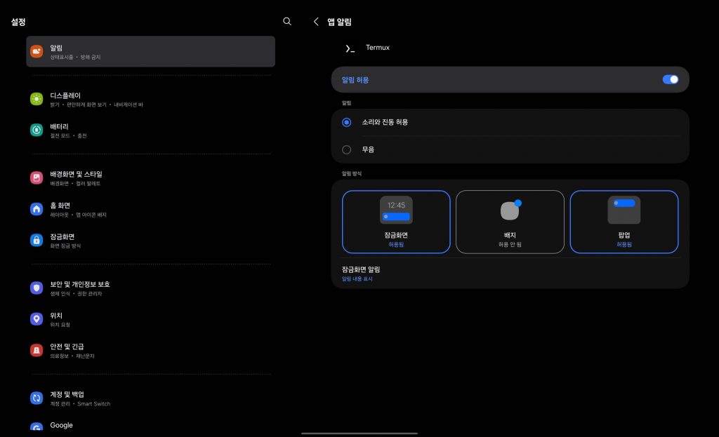 세션이 켜져있으면 Termux 앱 아이콘에 배지형 알림이 뜹니다. 없애기 위해 앱 알림 설정에서 배지형알림만 꺼줍니다.