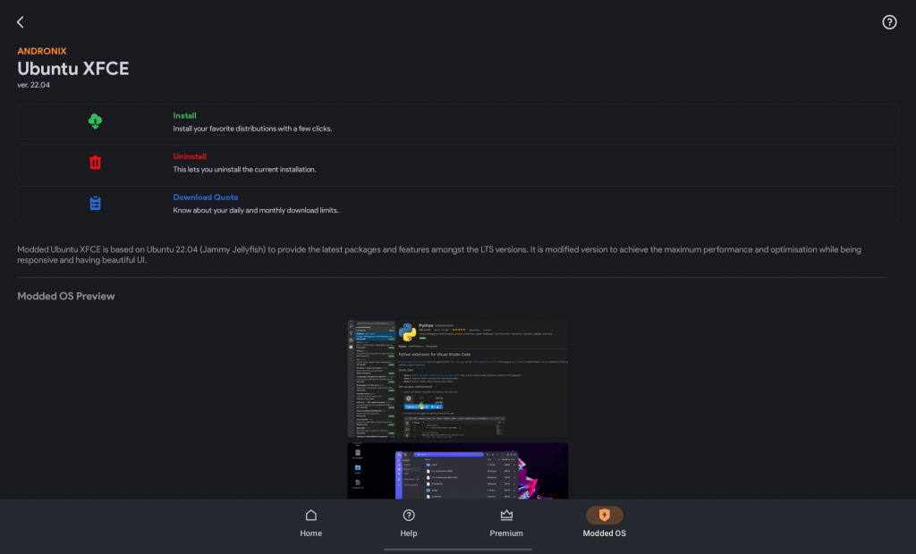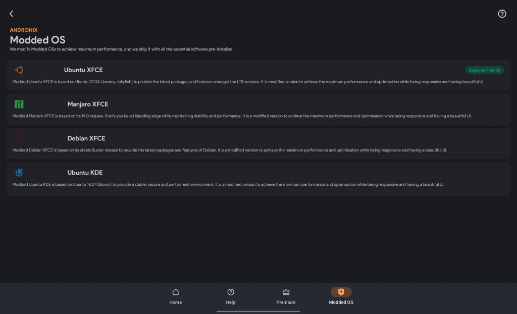 Andronix는 플레이 스토어에서 간단히 설치할 수 있습니다. Moded OS 항목에 보면 안드로이드 환경에 맞게 최적화 해놓은 우분투 버전을 사용할 수 있습니다. 여기선 4000원 정도 결제가 필요합니다. 필요없으시다면 기본 우분투를 선택하셔도 됩니다.