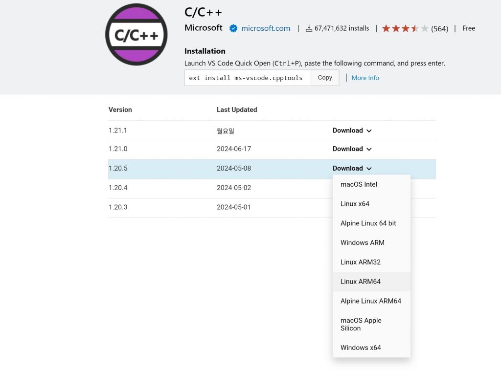 저는 최신버전에선 언어서버가 충돌하는 문제가 있어서 1.20.5버전을 사용했습니다. 저기서 Linux ARM64를 다운로드 하면 됩니다. C/C++ Extension Pack은 그냥 최신버전을 다운로드해도 문제가 없습니다.