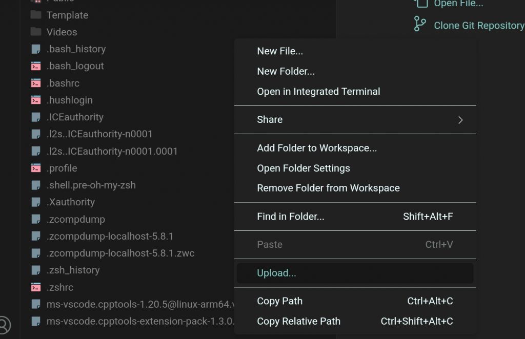 이제 확장을 code-server에 설치해야 합니다. 아까 VScode화면에서 Open Folder클릭 후 홈 디렉터리를 열어줍니다. 그리고 우클릭 후 upload를 선택하고 아까 다운받은 두 .vsix 파일을 홈 디렉터리로 이동시킵니다.