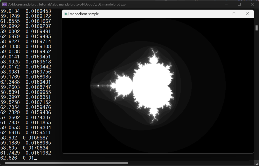코드를 수정하고 아래 화면과 같이 콘솔에서 각 행에 fps와 각 루프 실행 시간이 표시되면 됩니다. 콘솔 출력의 모든 첫번째 열에서 main.cpp의 11번 줄에서 설정한 FPS 제한 값인 60 언저리의 값이 출력되는 것을 볼 수 있습니다.