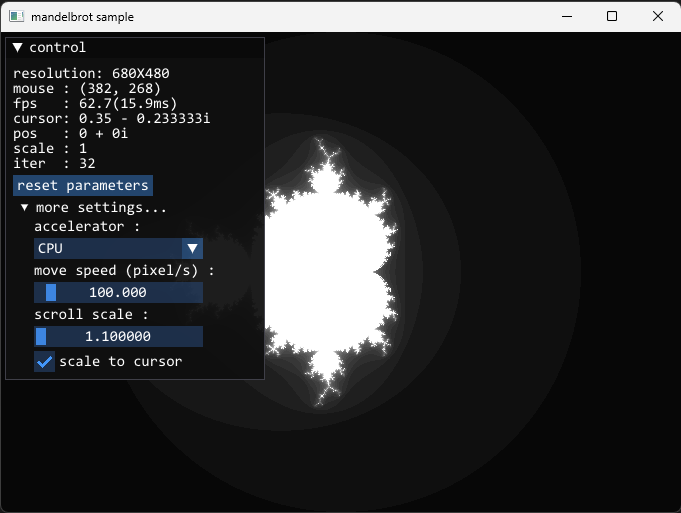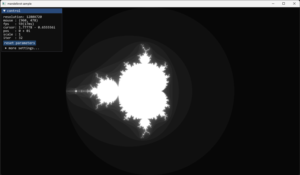 이제 코드를 실행시켜보면 깜찍한 GUI를 확인하실 수 있습니다. 아래의 more settings…를 누르면 추가로 설정할 수 있는 항목이 표시됩니다. 근데 화면 해상도가 너무 낮아서 GUI가 너무 공간을 많이 잡아먹는 느낌입니다. main.cpp의 INITIAL_WIDTH와 INITIAL_HEIGHT를 수정해서 해상도를 더 올리도록 합시다.