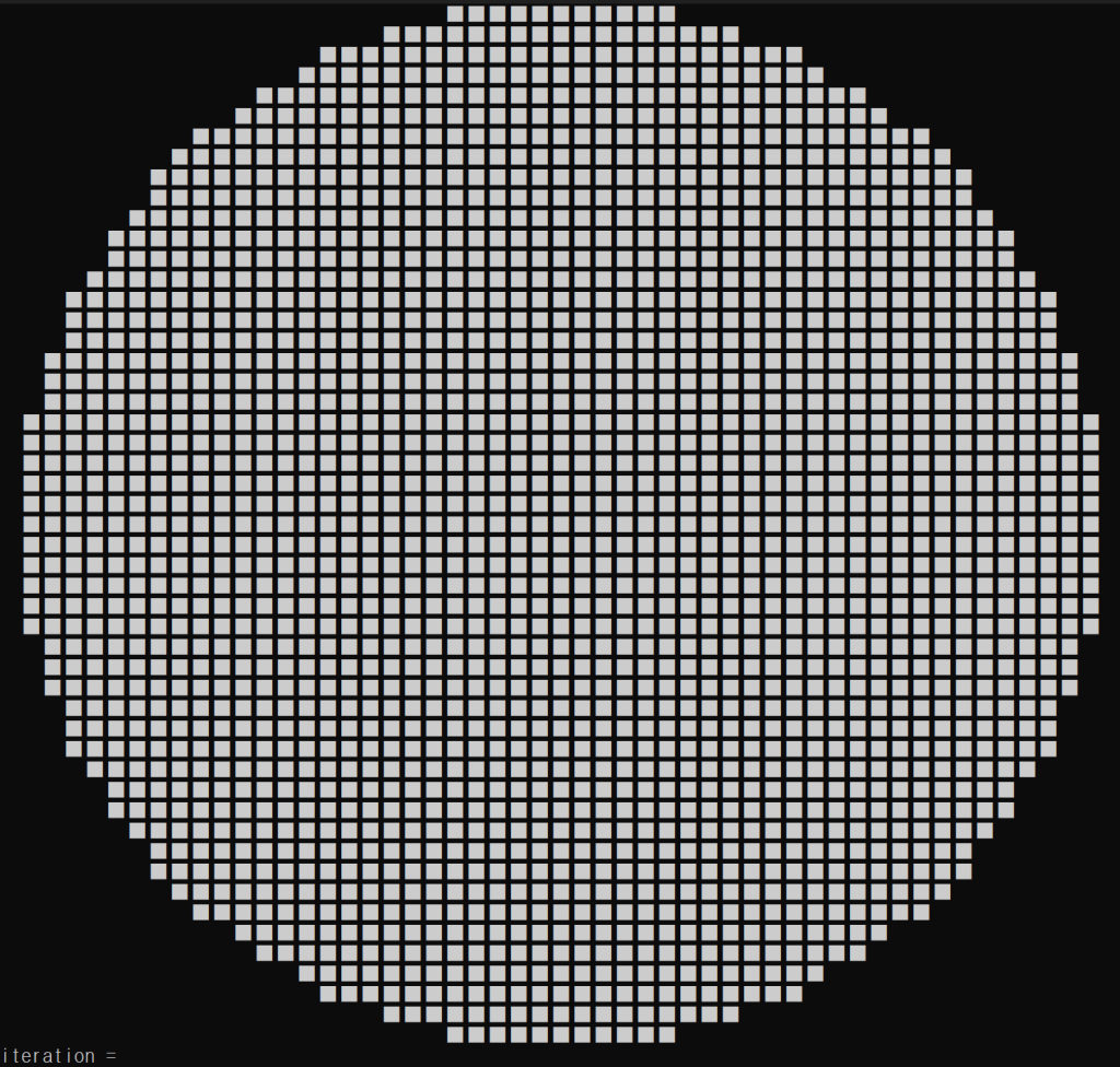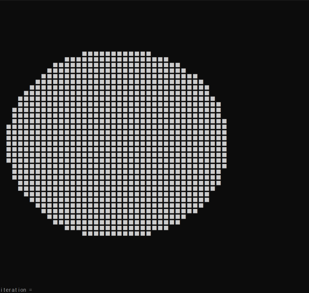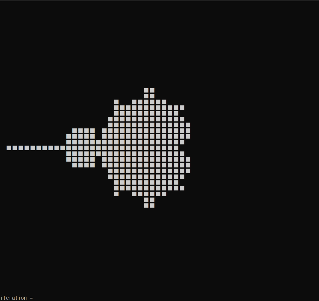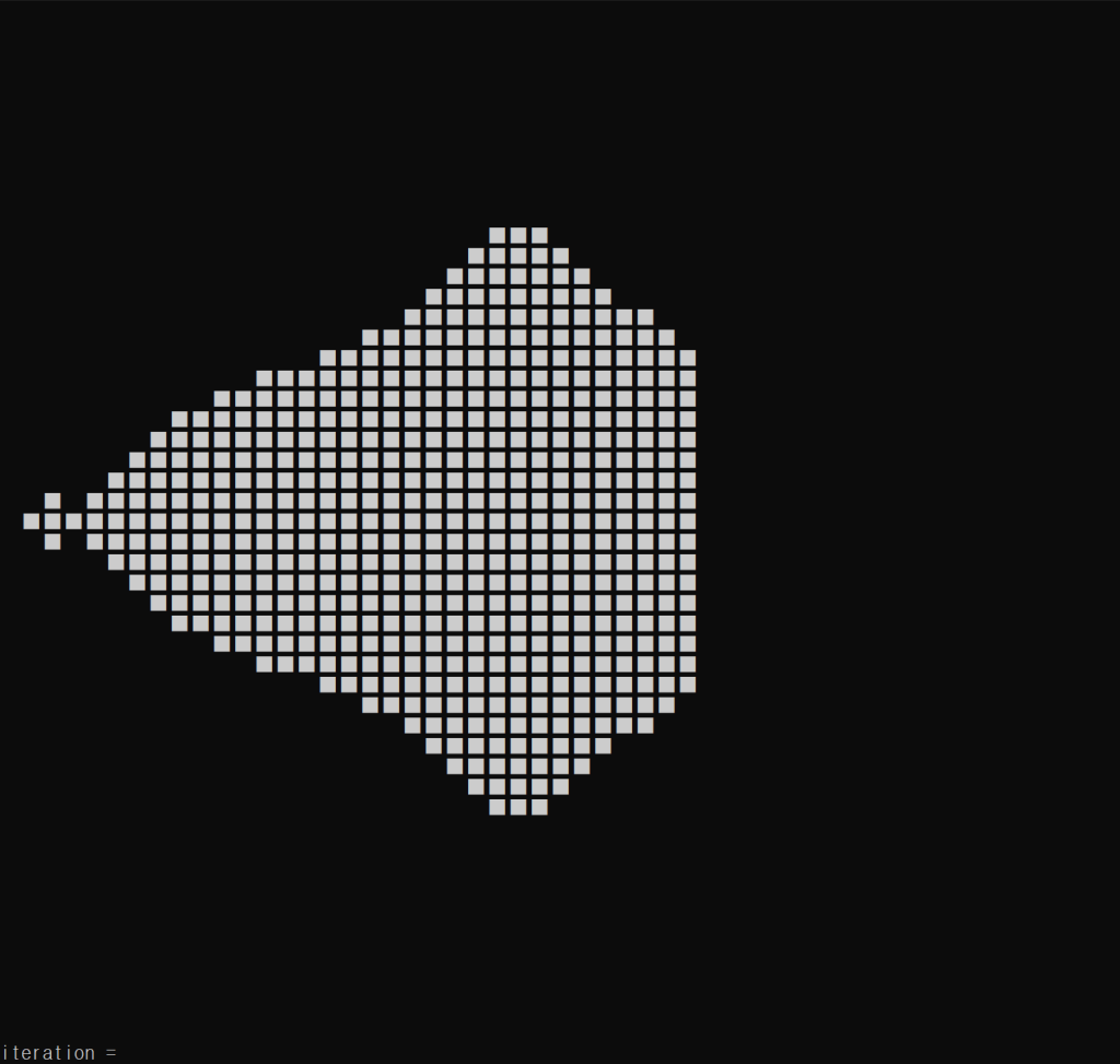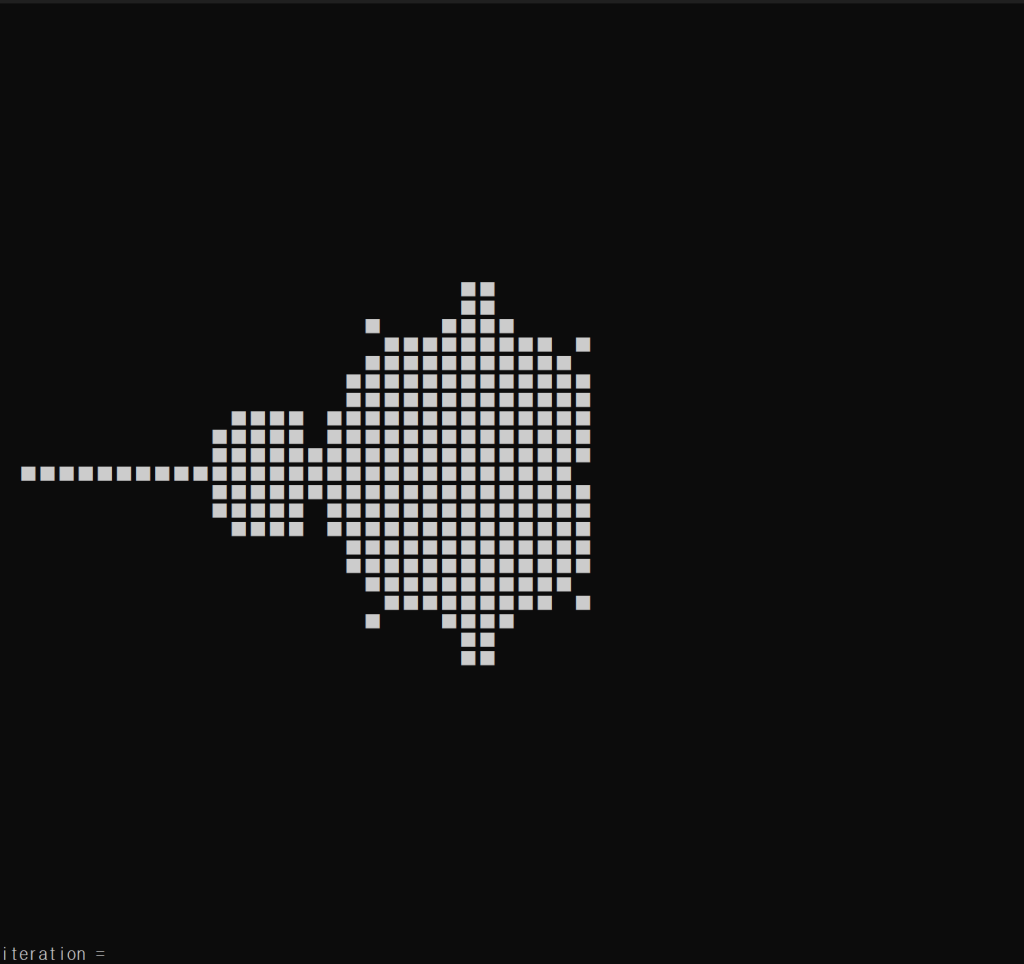 콘솔에다가 바로 출력하기 때문에 코드는 아주 간단합니다. 빌드 전에 width와 height에다가 원하는 가로 세로 픽셀을 입력하고, 실행 시에 원하는 반복 횟수(iteration)을 입력하면 됩니다. 종료하고 싶으면 반복 횟수를 0으로 하면 됩니다. 코드를 실행시켜 보면 콘솔에서 아래와 같은 출력을 얻을 수 있습니다(width, heigth = 51, iteration = 1, 2, 4, 8, 16, 32).