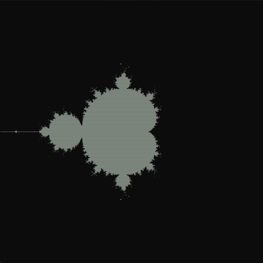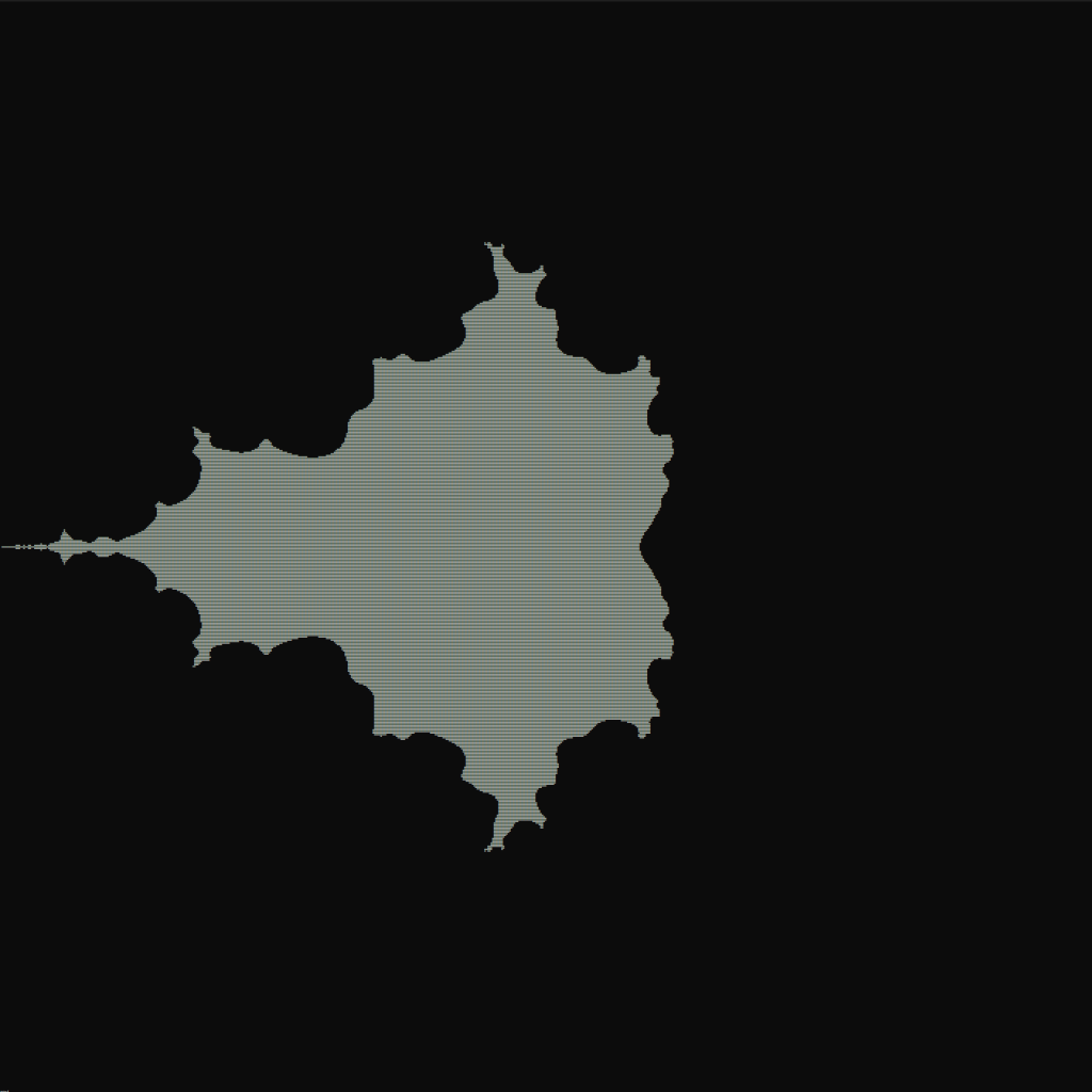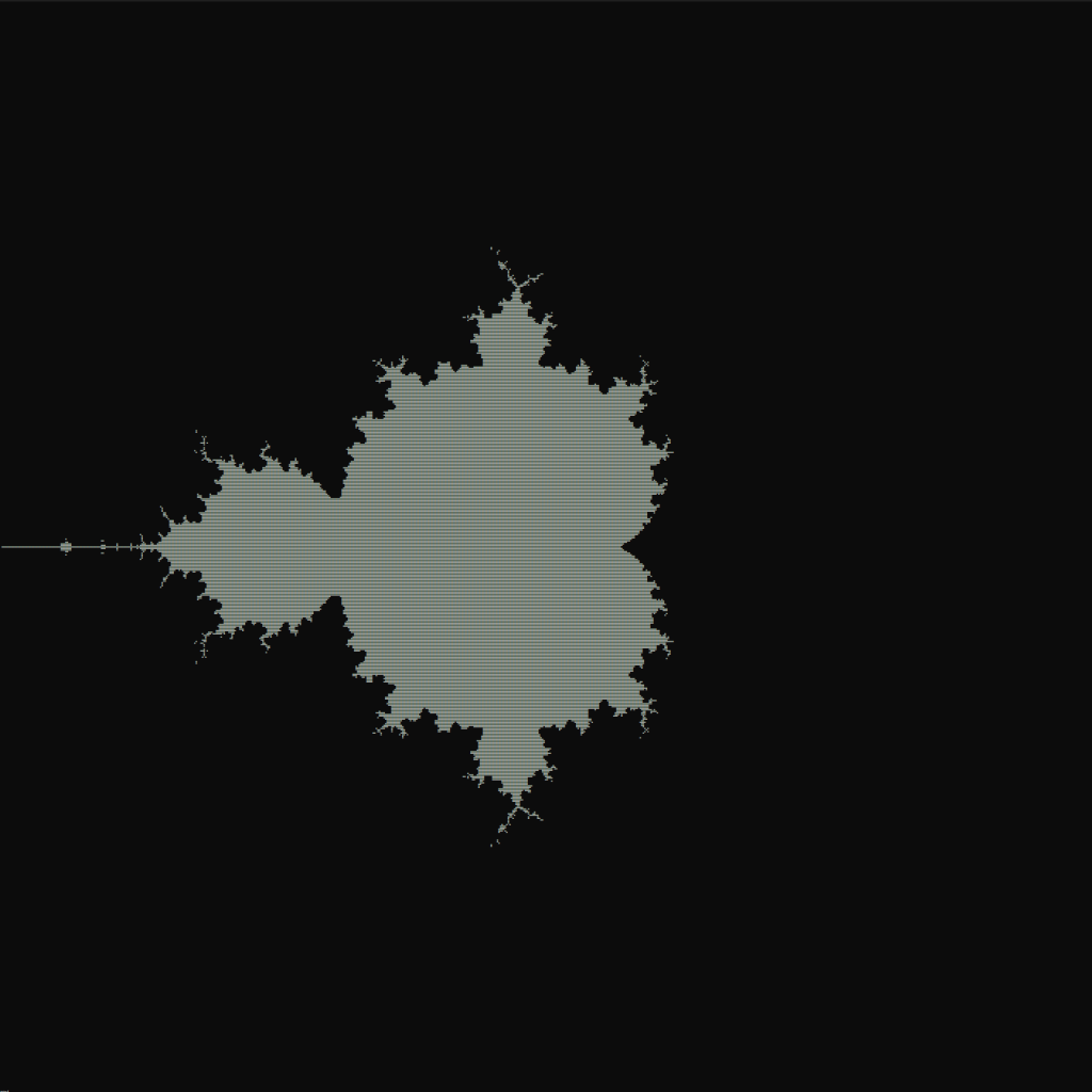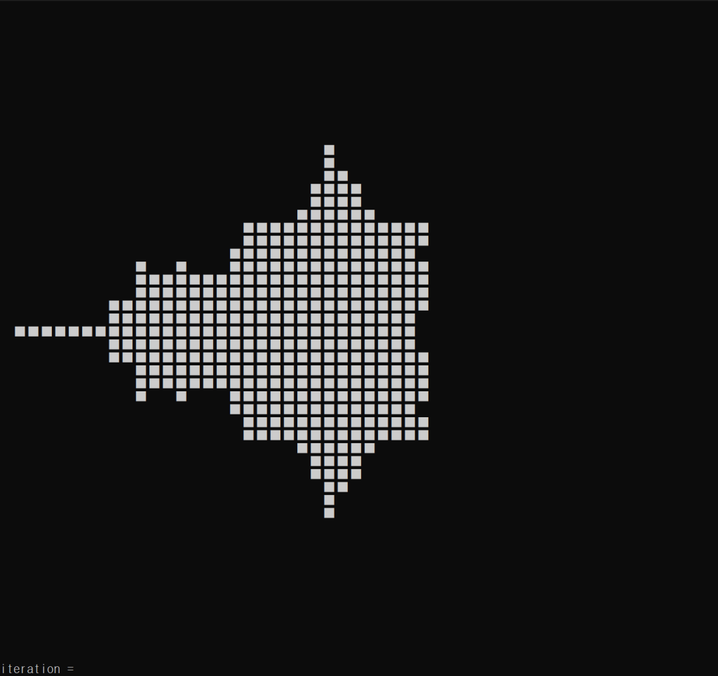 만약 더 좋은 해상도로 보고 싶다면 윈도우의 경우 콘솔 위로 마우스 커서를 옮기고** ctrl + 스크롤**을 하면 화면 배율이 조정됩니다. 그렇게 콘솔을 최대한 작게 만들어 두고 전체화면으로 전환해서 width, height를 적당히 크게 조정하면 거의 이미지 수준의 출력을 얻을 수 있습니다(마찬가지로 iteration = 1, 2, 4, 8, 16, 32)